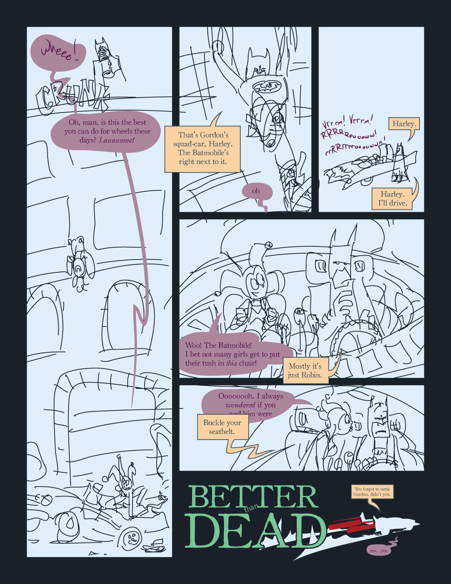 I never finished this for two reasons: one, I couldn’t come up with a Joker scheme that really had the malign illogic that’s the hallmark of his schemes, and two, the likelyhood of it ever being published is small. I got some funny Batman and Harley drawings out of my system and that’s all it really needed to do.