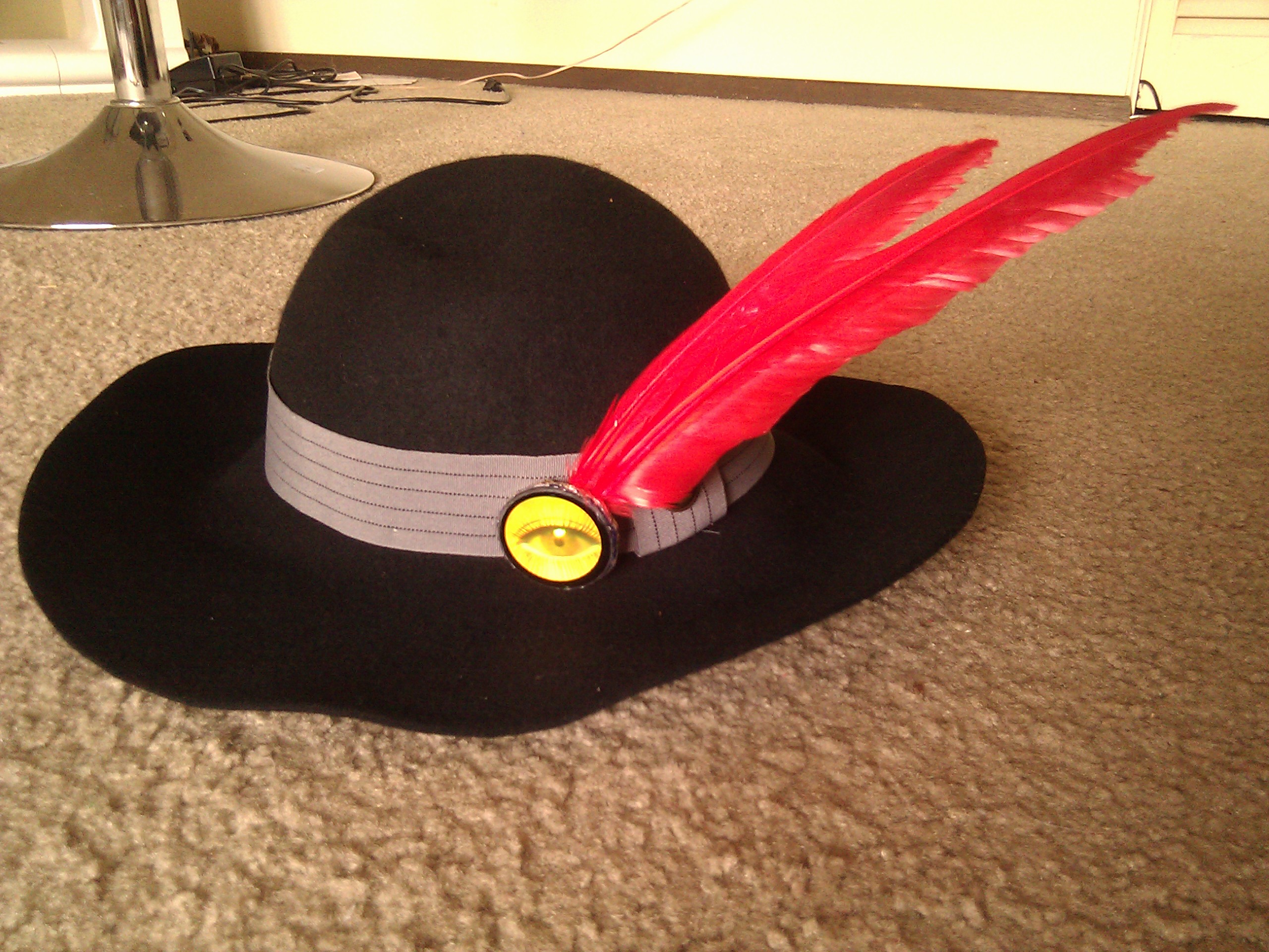 It is also dirt cheap; I think I spent like $5 on the components and have enough to make another one. The eye comes from a pair of comedy “always awake” glasses with holographic eyes on them; it’s hot-glued to a glossy piece of black cardboard, and the feathers and a pin are glued to the back of that.