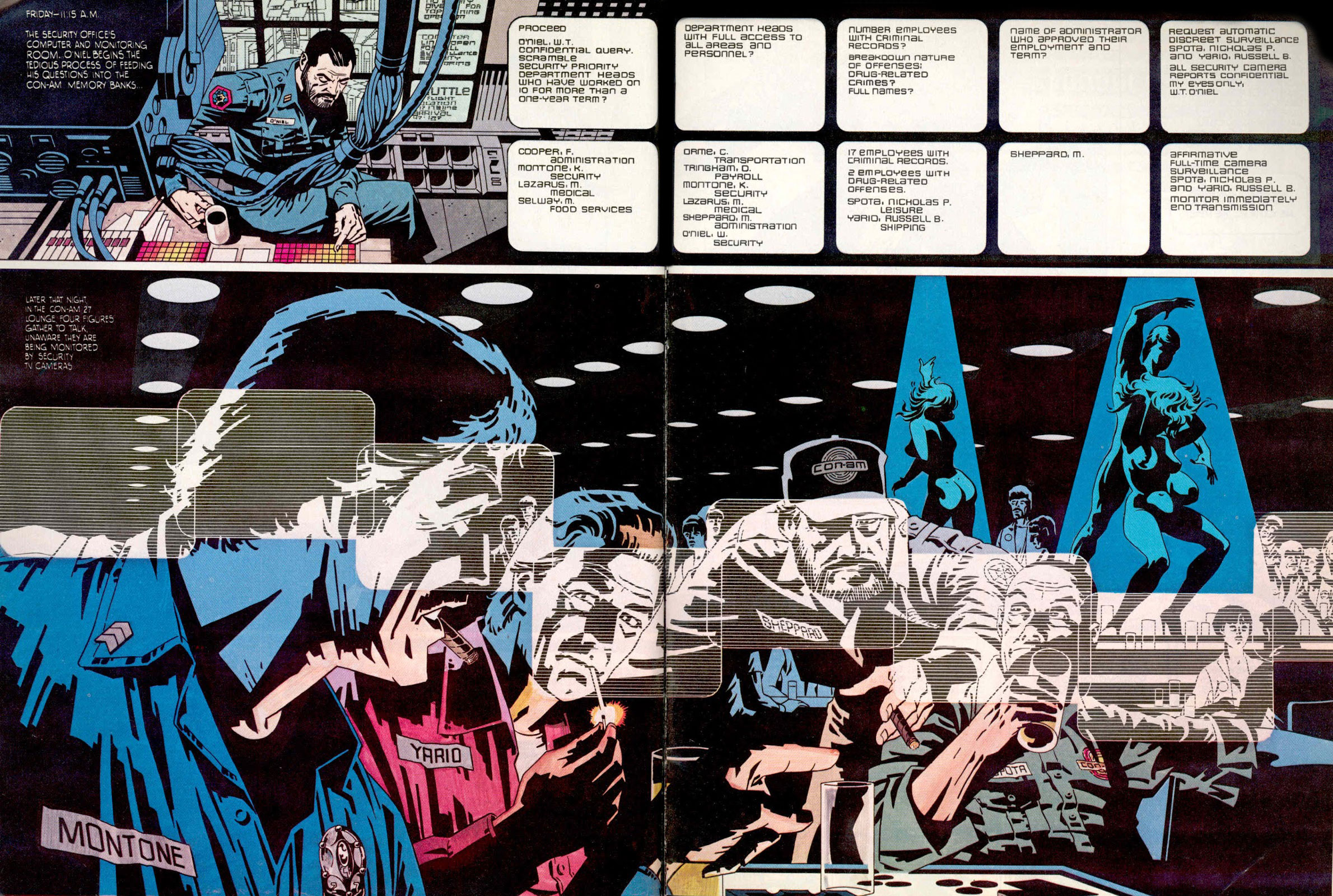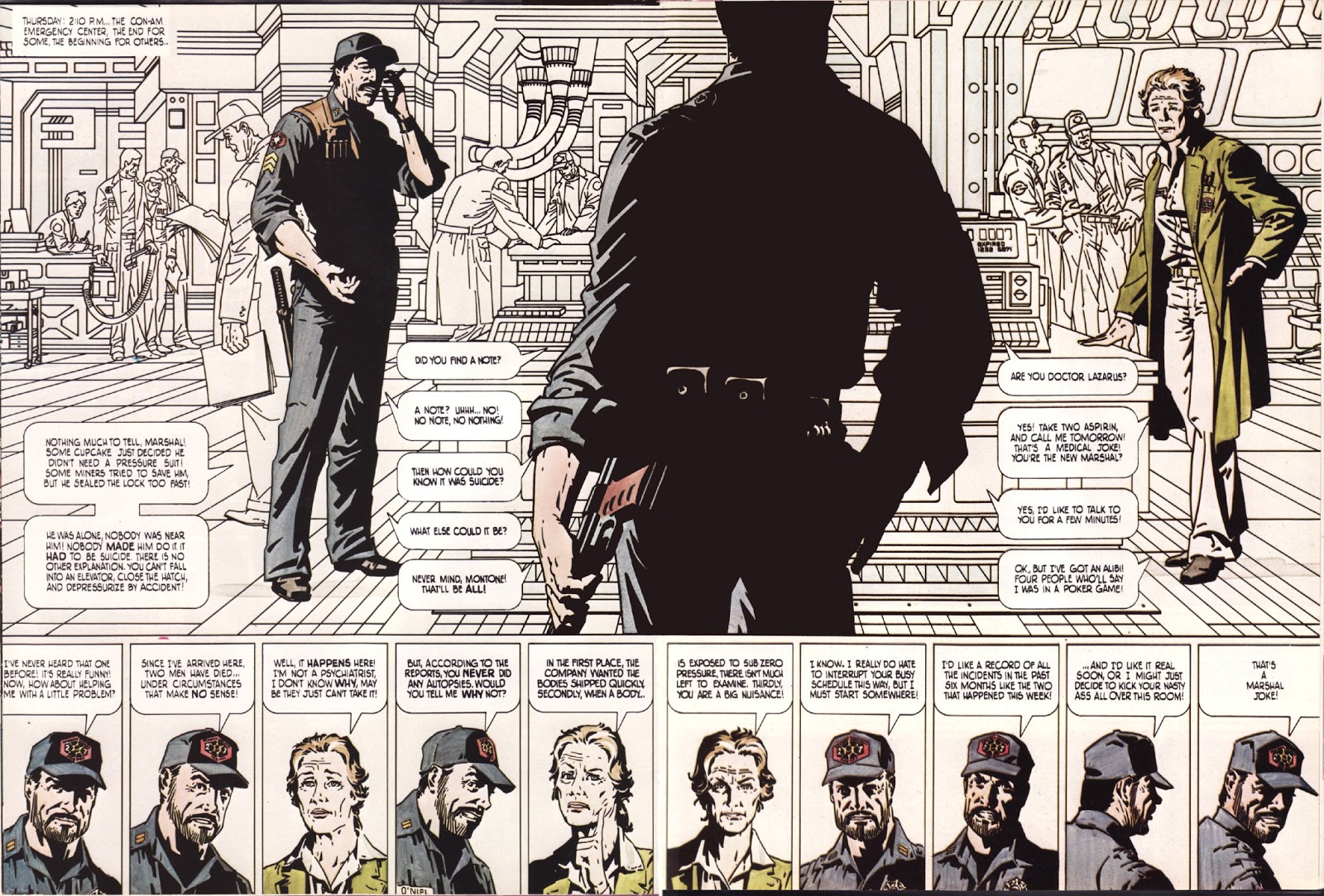 Also here is a cool thing: Jim Steranko did a comics adaptation of the 1981 SF movie “Outland”. It ran in Heavy Metal over six months, then was collected – but only in France. He drew it almost entirely in double-page spreads, with lots of huge drawings balanced against rows of smaller ones. If I’d seen this before starting Rita, I might have done some different panel rhythms – and I still might swipe from it for the final volume. Which is kind of coming full circle; the initial flash of Rita climbing up the side of a building, rendered very starkly and bluely, came when I was in the shower after reading an article talking about the first issue of Steranko’s run on “Nick Fury, Agent of SHIELD”. I guess maybe if I ever run into him at a con I should say “hey thanks for the inspiration” and pass him a copy or something.
