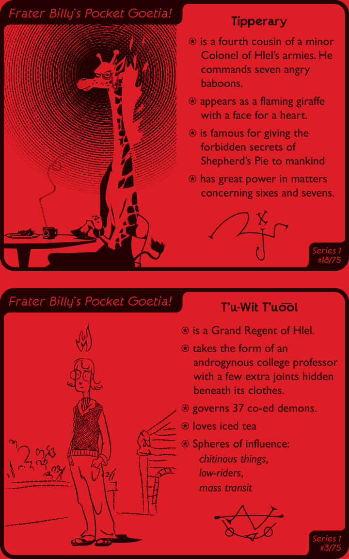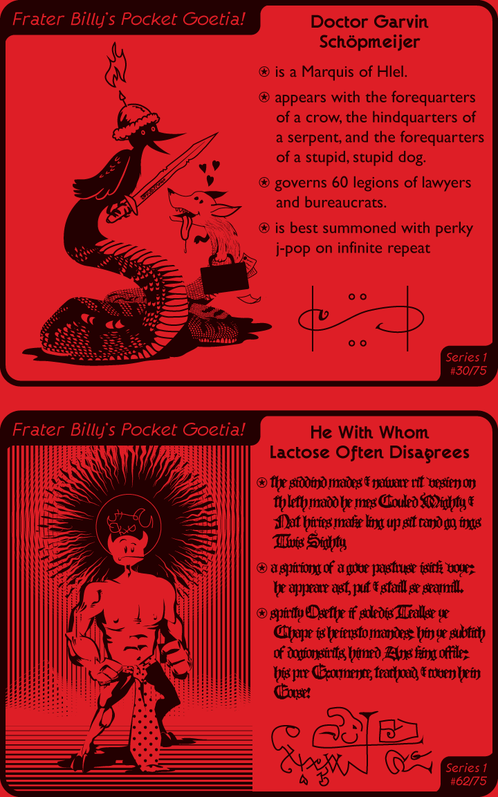 So a while back Evan Dahm put together a zine called “Hail Stan” – printed in B&W on lurid red paper, the premise was that it was misremembered, misspelt, and misunderstood Satanism. I couldn’t pass that idea up, and drew these things for it, then forgot about them until I found them while looking through last year’s working directory just now.