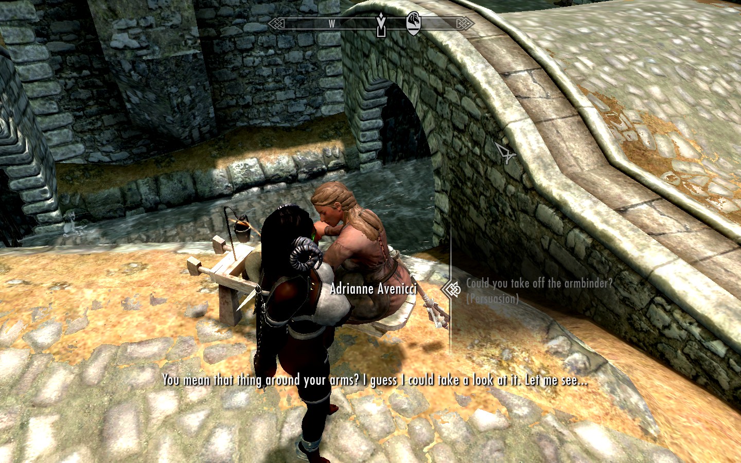 Oh, did I mention that while you’re in the armbinder, any attempt to bring up your map, inventory, or magic is intercepted, and replaced by a little pop-up message telling you how firmly bound your arms are, and giving you the opportunity to “open it”, “struggle”, or “live with it”? If you choose “struggle”, you get a cute little animation that lasts for a few seconds, followed by a heartfelt sigh and another pop-up message that tells you that you’re no match for the strong leather sheets and straps. So I really had absolutely no idea where I was until I recognized a landmark.