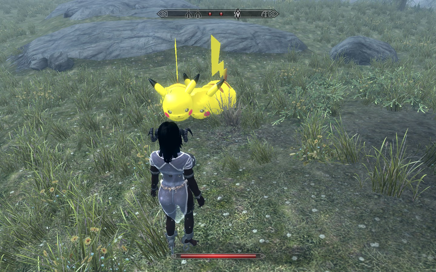 Apparently I’d installed a “replace skeevers with Pikachu” mod at some point. They did not exhibit an electrical attack – in fact I think Saturnalia blew these guys into smithereens with an electrical blast, then promptly collapsed into a whimpering, vibrating heap. Combat as a spellcaster is really interesting when you know that can happen at any time; luckily everyone just kinda stands around watching you play the “helpless masturbation” animation until your character regains enough sanity to respond to your inputs again.