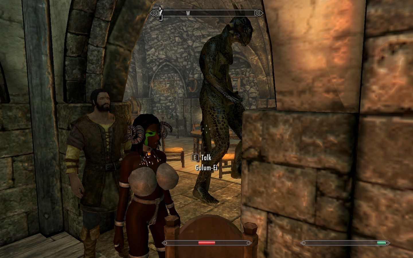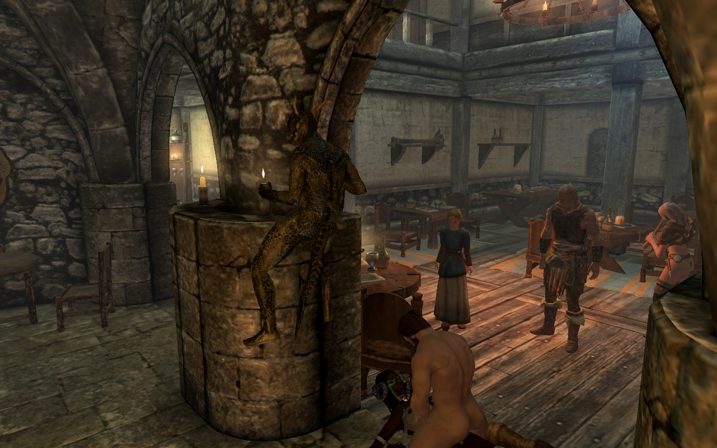 At one point when Saturnalia was whoring, things tried to turn into a threesome. Sadly, she still only had one hole available at this point. And was standing very close to a column when the sex started. So this Argonian joined the fun by just kinda… teleporting halfway into the column, several feet off the ground, and humping it wildly.