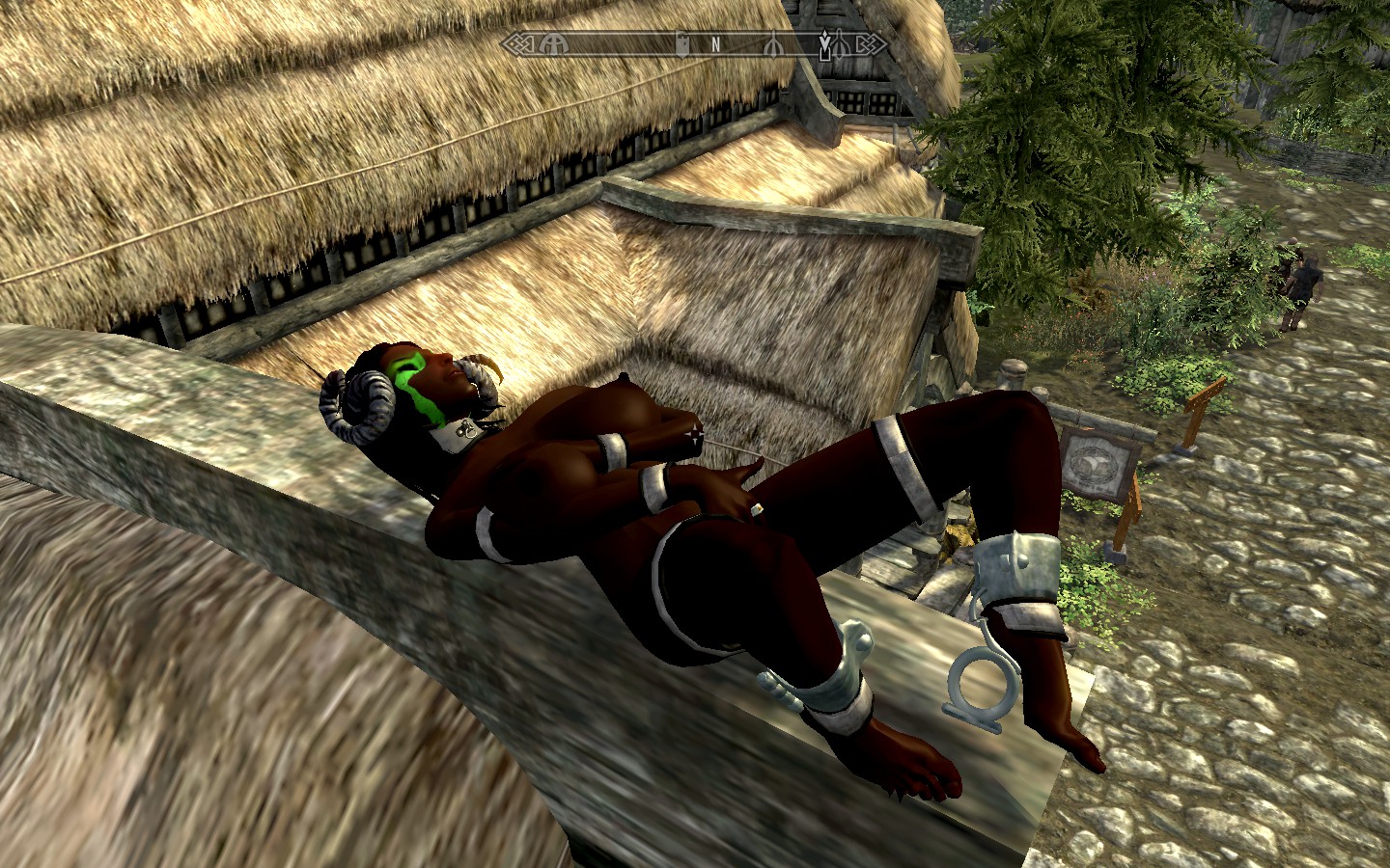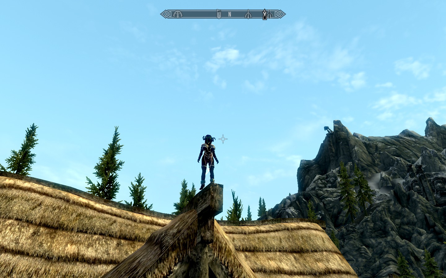 Down in summery Falkreath, she climbed up on top of a building, stood there dramatically in the sun…