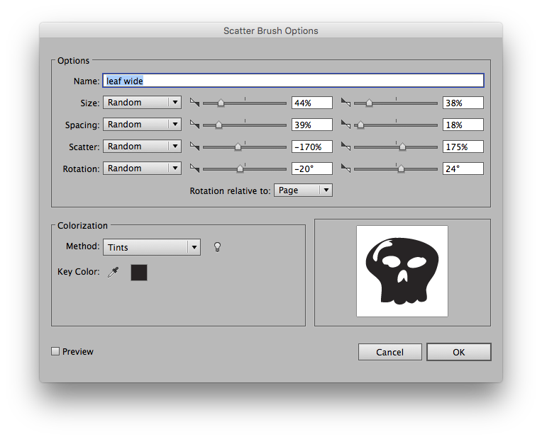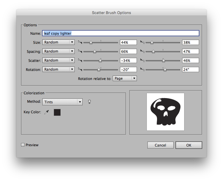 edit: here, have some brush settings. They’re all called “leaf” because I started with one of my standard toolkit brushes, a jaunty little rectangle scatter brush I use for abstracted leaves. I ended up replacing them with a skull made up of five paths (overall shape, each eye, nosehole, highlight) joined into a compound path. I made the others by just duplicating the first brush and changing the settings, mostly by either widening the scatter range to create a broader stroke, or by raising the spacing to make it lighter. You could easily make a few more if you wanted to take a stippled piece further than I did here. Things may start to get a little sluggish though. Use multiple layers, hide them and maybe make simple gradient proxies, consider writing up a feature request for something like Expression’s “freeze layer” function again. (Expression was a wonderful natural-media vector package that Illustrator is still trying to catch up to; one thing it could do was “freeze” a layer. Which was like locking it except it also rendered a moderately high-res bitmap, and used that for building the preview instead of rendering everything from scratch. It made working with complex drawings a lot faster.)
