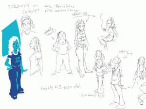 Remember the square captions with a “>” in the beginning of their text from the first few pages? I figure we’ll be meeting their source soon, so I’m trying to decide what that person looks like. The only thing I’m really sure of is that she has long wavy white/blonde hair, the rest is obviously being played with. I’m not even entirely certain this should be a she, but I think I do kinda prefer that to male or other.