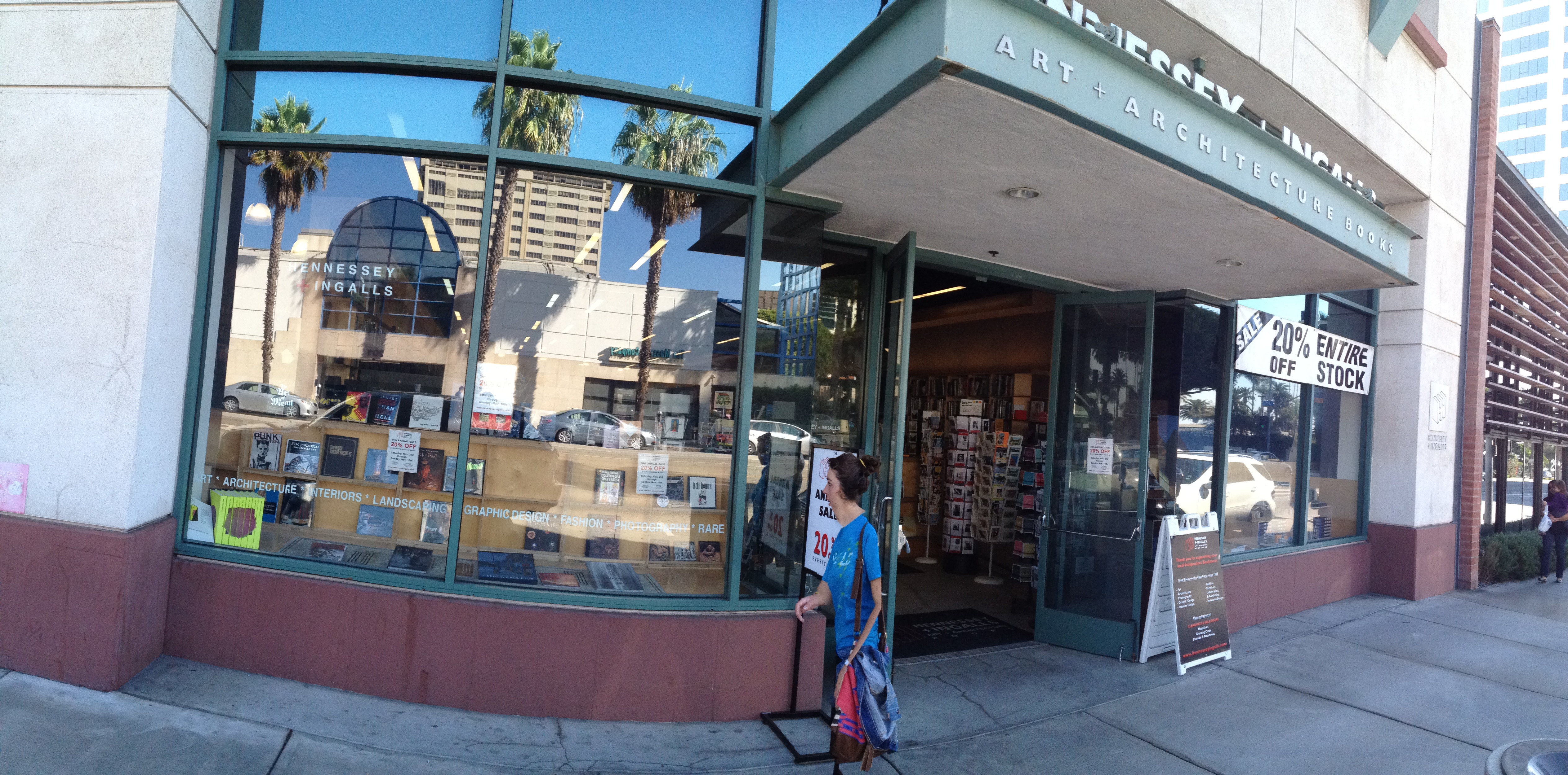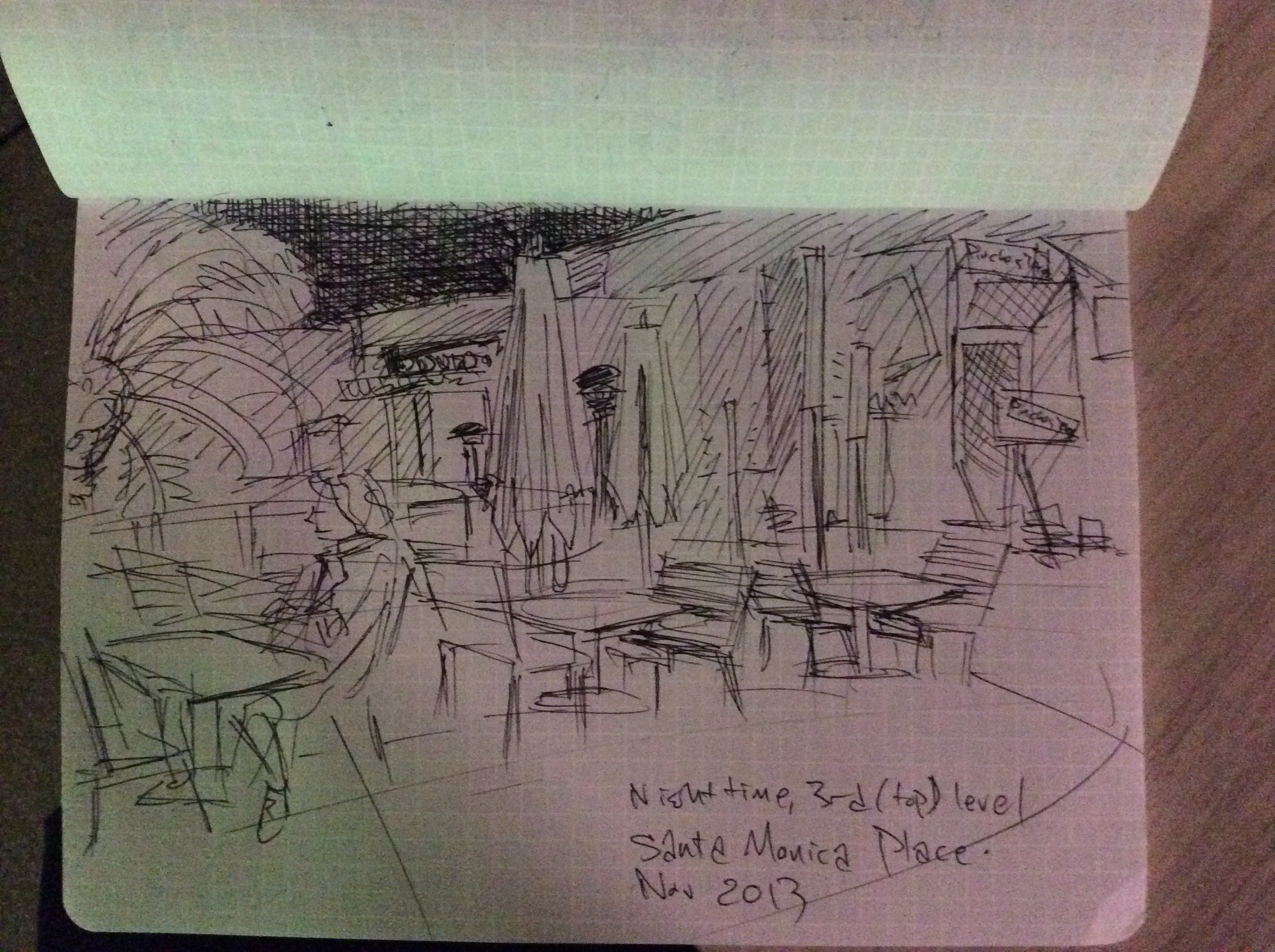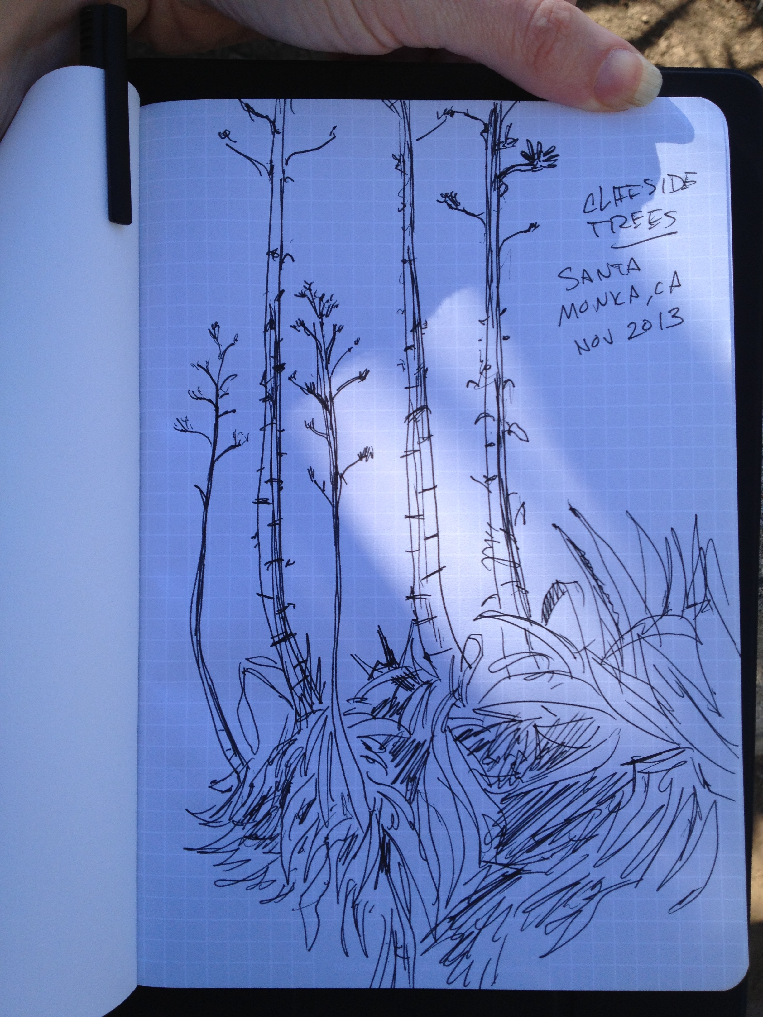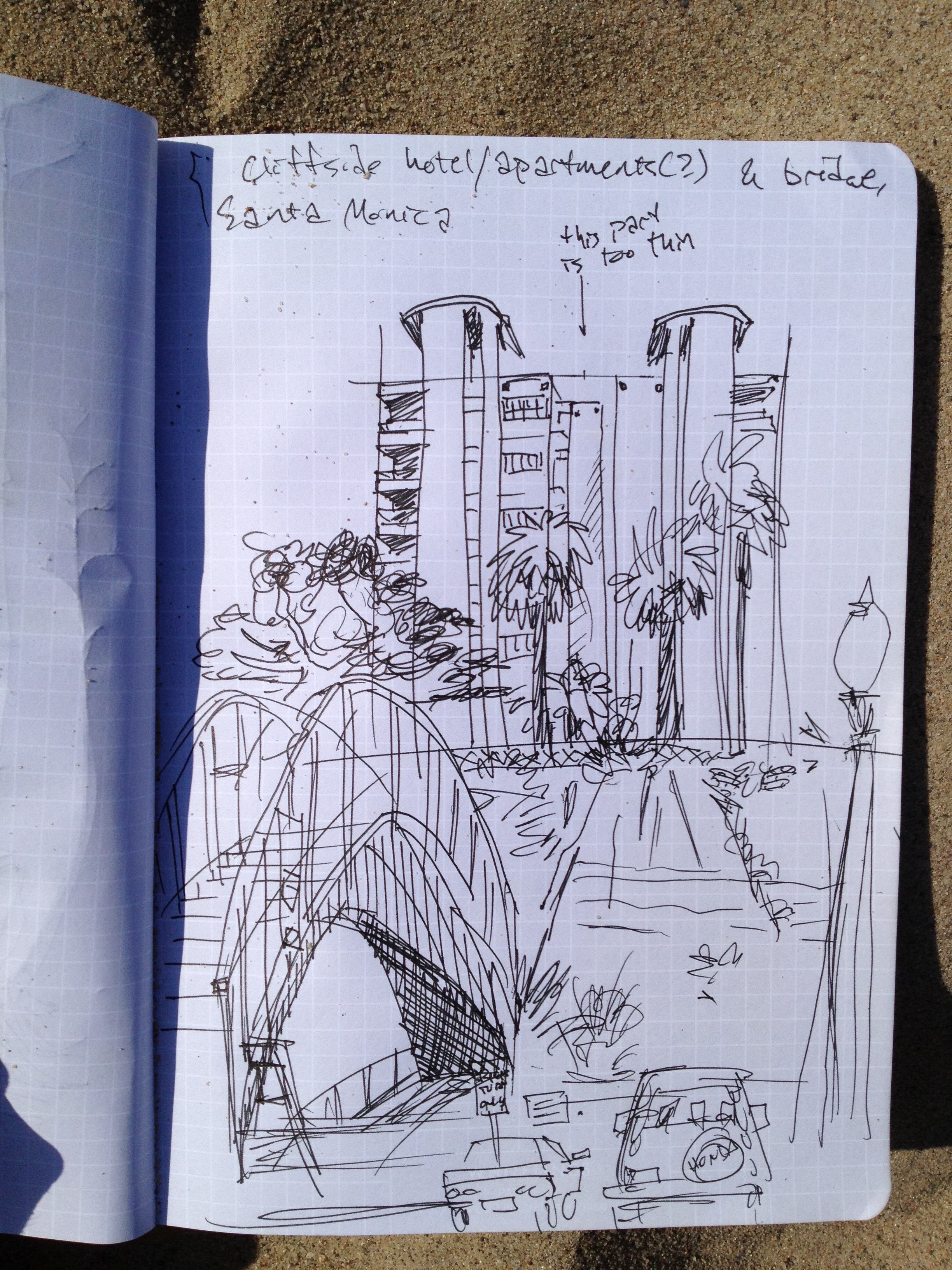 But on the way from 3rd street to 2nd, I got distracted by the magnificence of Hennessy & Ingalls. They used to be on the Promenade; now they’re just off of it, and I think even more amazing. I’d go in there now and then when I lived in Santa Monica and browse, but rarely buy anything due to being broke. This time I was able to just wander around and grab whatever caught my eye and have it shipped home; I got a book full of Maurice Noble’s production sketches and a book on staircases. I spent $75 on a book full of nothing but photos of staircases; I have become decadent. I also picked up a little softbound sketchbook because I wanted to draw some stuff.
