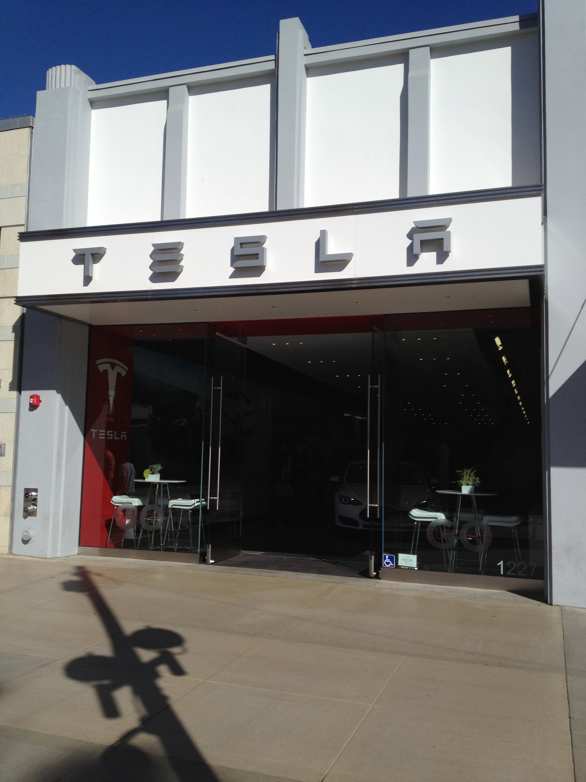 – and a Tesla dealership, complete with cars lurking inside (and, I am told, available for test drives out the back side of the store) –