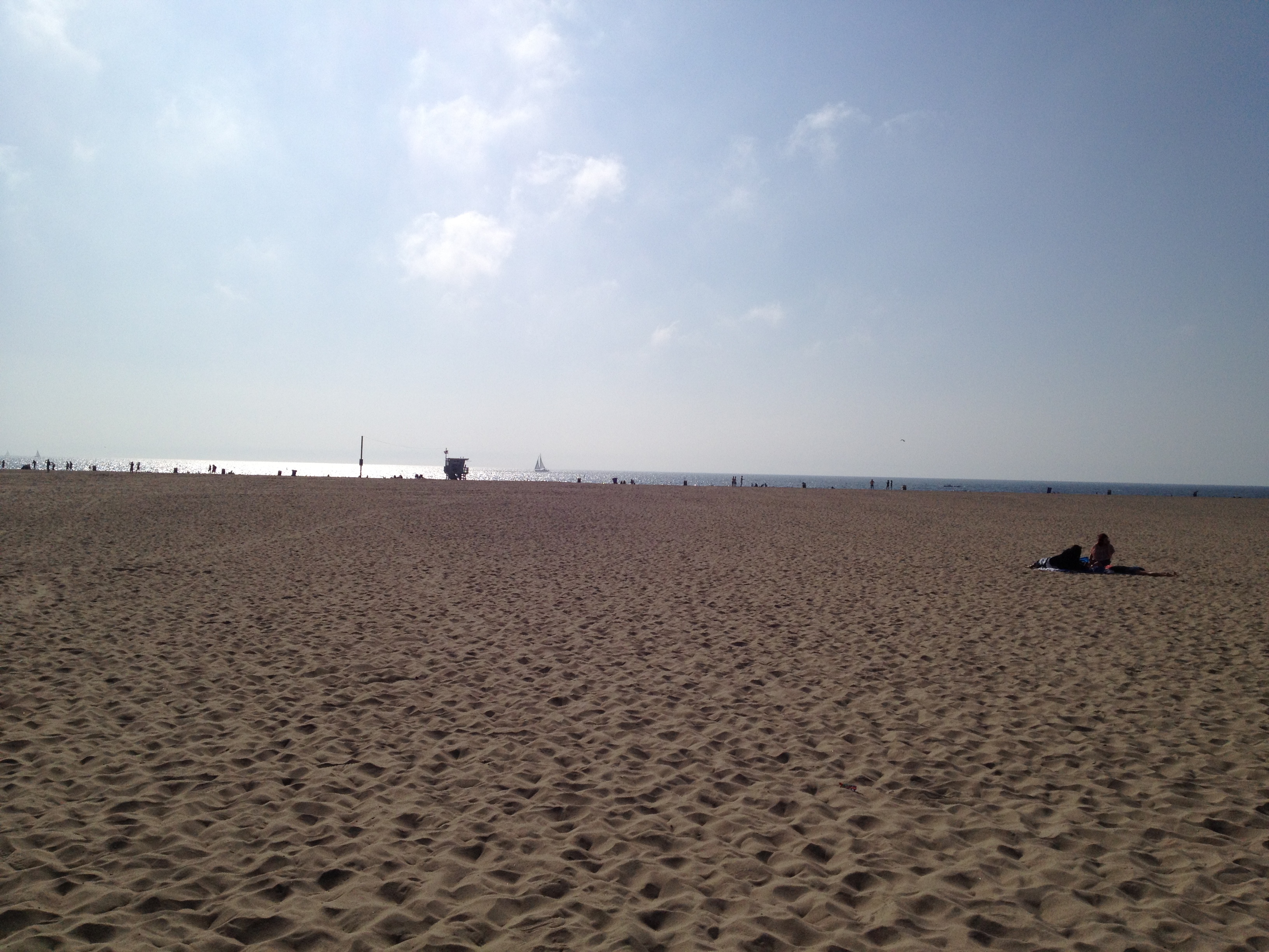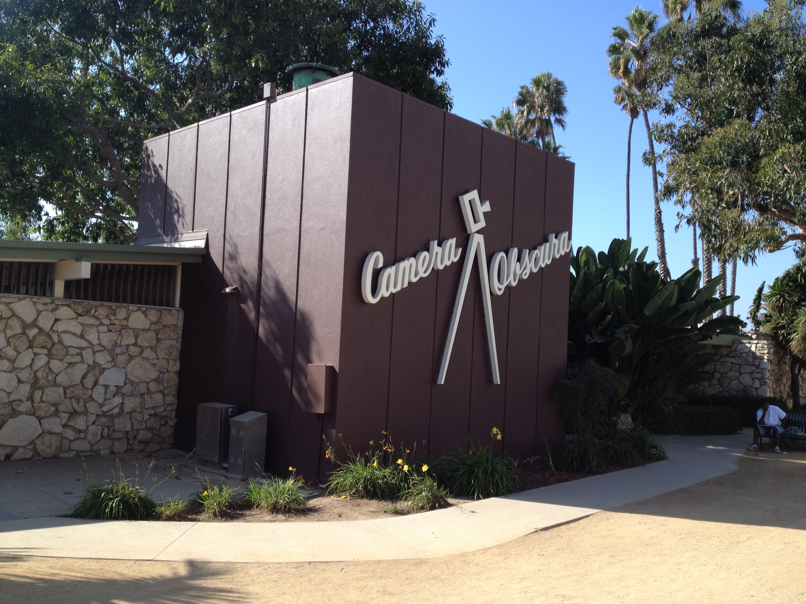 Then I wandered down towards the beach. Santa Monica’s got an abrupt drop from the level of the city down to the beach; there’s a lovely strip of park that runs along the top of this cliff. One enigmatic feature of it is this building labeled as a Camera Obscura. I’d never actually wandered into it when I was a depressed boy; coming back as a pretty happy lady I couldn’t find a way in. It will remain an enigma to me. The guy sitting in its shadow was a homeless dude who asked if I had a marker; after reflexively saying “sorry, no,” and walking past, I remembered that I did have a marker on me, and a fairly nice one at that. I pulled out the black Prismacolor sitting in my bag and gave it to him. He was quite surprised when I told him he could keep it. I figure there’s 4-5 signs in it, it’s worth a lot more to him than to me.