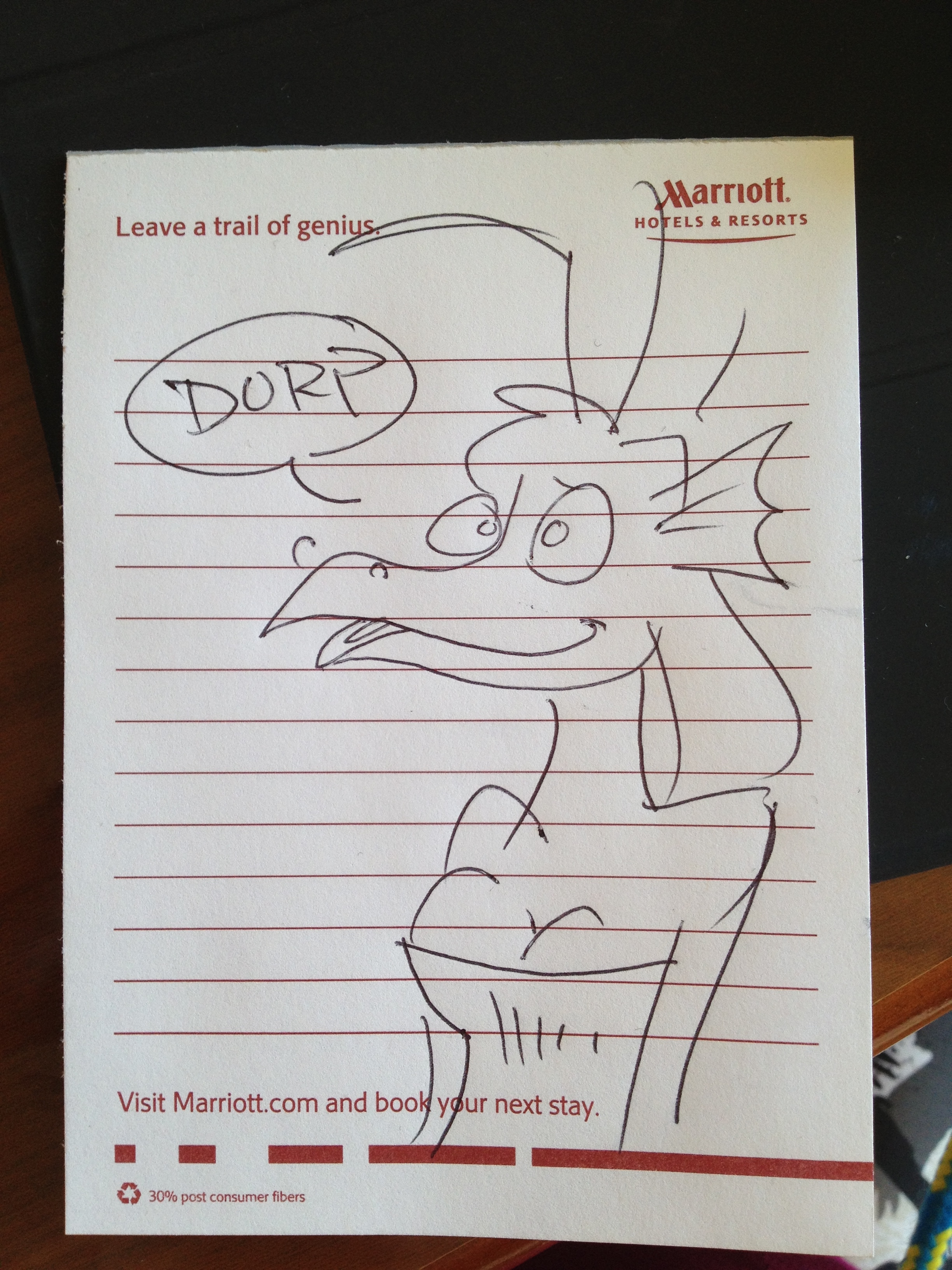 A few weeks ago, I’d gotten some art books for my friends’ kid Lucy. One of them was Gurney’s ‘Imaginative Realism‘. The two things I really took away from it were (1) man this guy sure makes a lot of reference models, and (2) when Gurney has time to kill, he takes his sketchbook out and draws whatever the fuck is nearby. Doesn’t matter if it’s “interesting” or not, he just draws stuff around him. I used to do that second thing myself, but ever since switching from a large backpack to a small purse it’s fallen off, and since getting a smartphone it’s pretty much stopped. I’ve decided to try and change that, so I’m pretty delighted to have done no less than three observational sketches during this one day out. I think the sketchbook I did those in is going to start just living in my bag all the time, with a pen nearby. I’ve started a tumblr called “James Gurney Would Be Drawing Right Now”, which I’ve written on the cover of that book as well; if you want random observational drawings, then follow it.