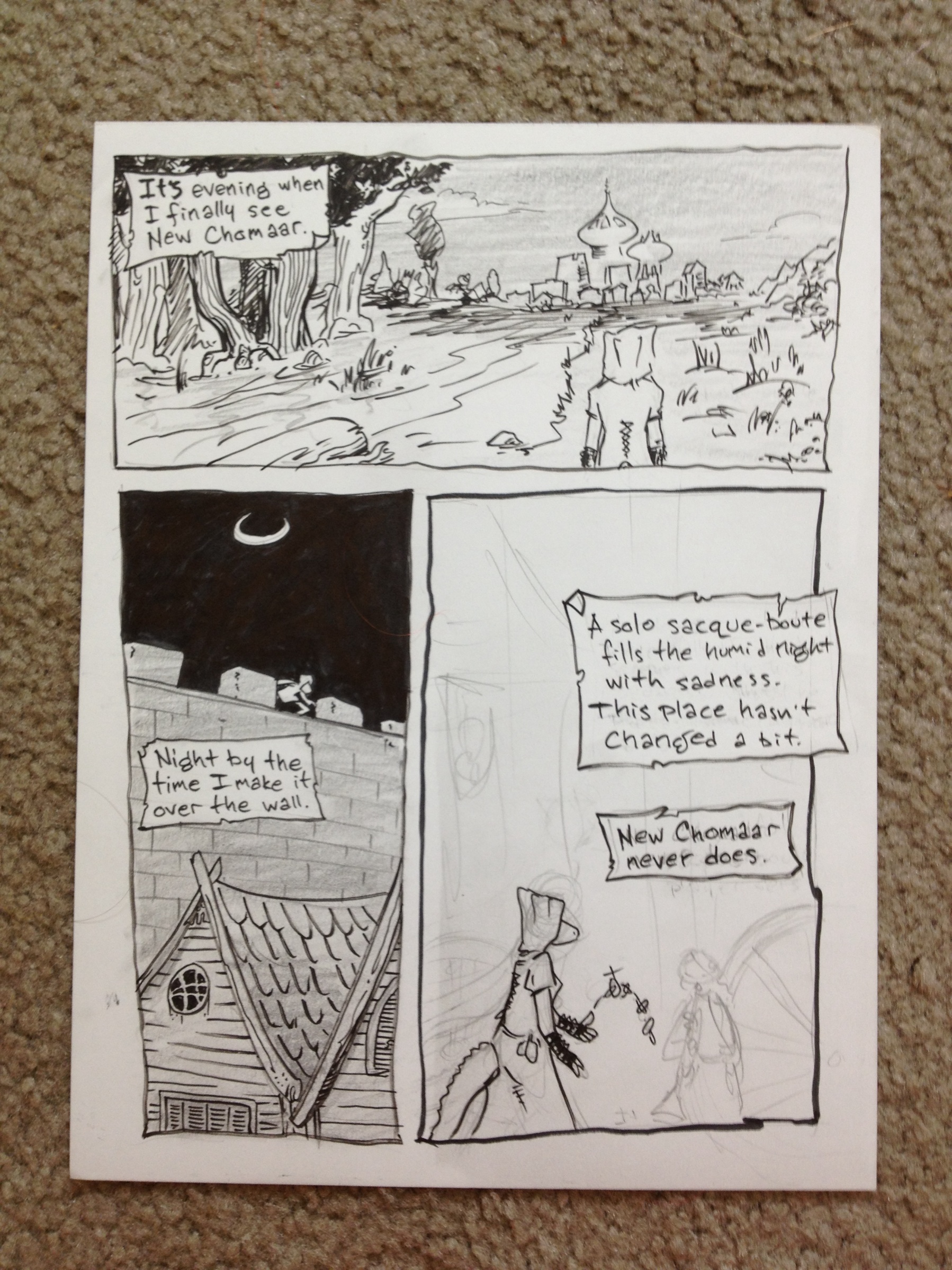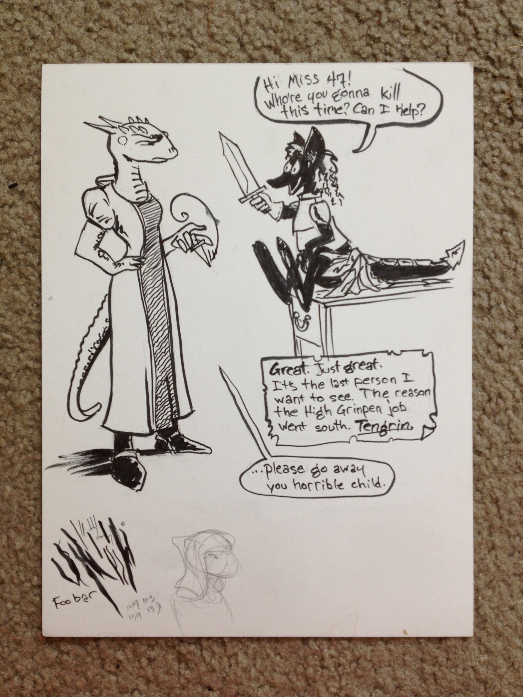 Fragments of a comic about 47, the lizard assassin I ran in Skyrim for a while. This was some stuff I kicked around with Nick; the swamp kangaroo is his idea of a foil for 47, and this story would be set in a swampy town that constantly picks up and moves itself due to some absurd local horror. Hence the wheels on the buildings.