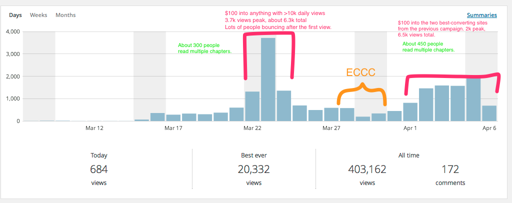 All advertising was on various webcomics via Project Wonderful, an ad network primarily used on webcomics. Which narrows my focus to “people who are already interested in reading comics on the web”. I need to find places to advertise to “people interested in science fiction” as well.