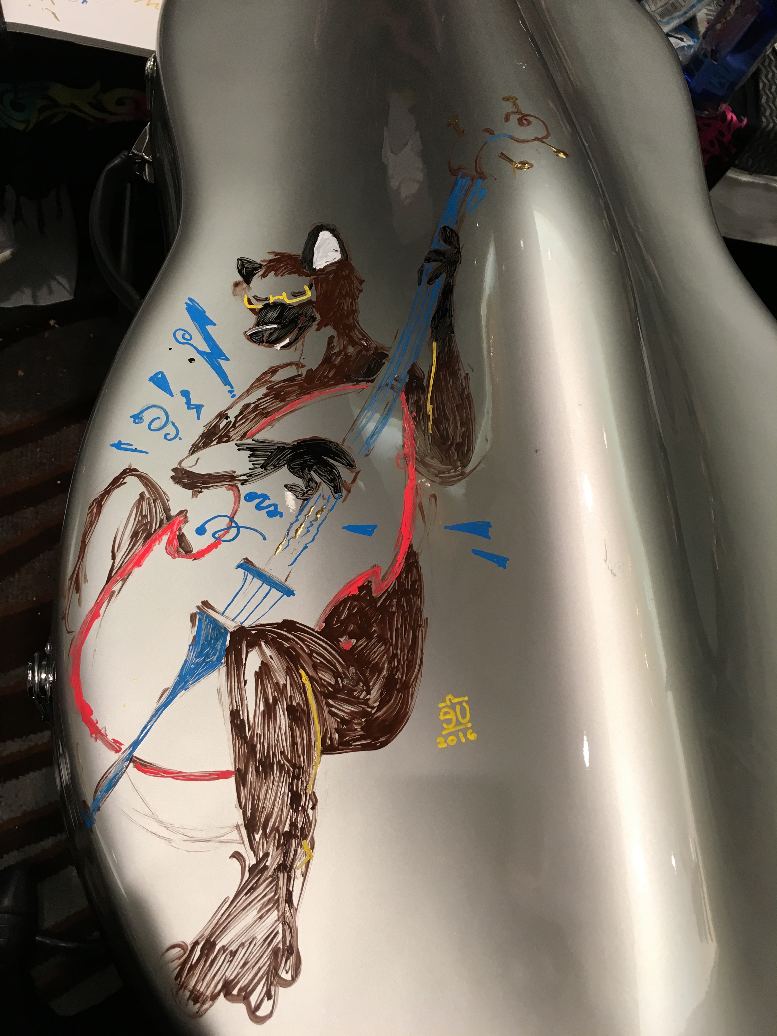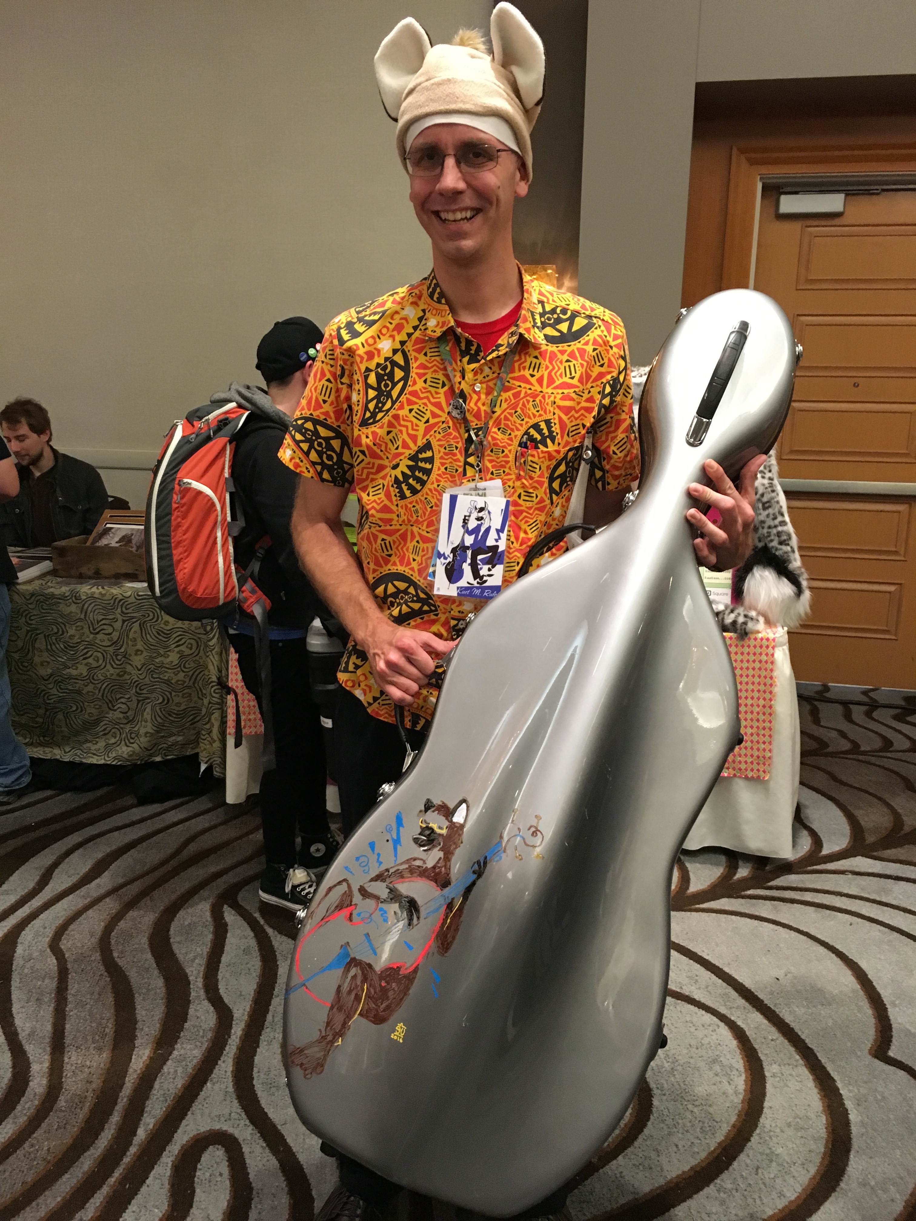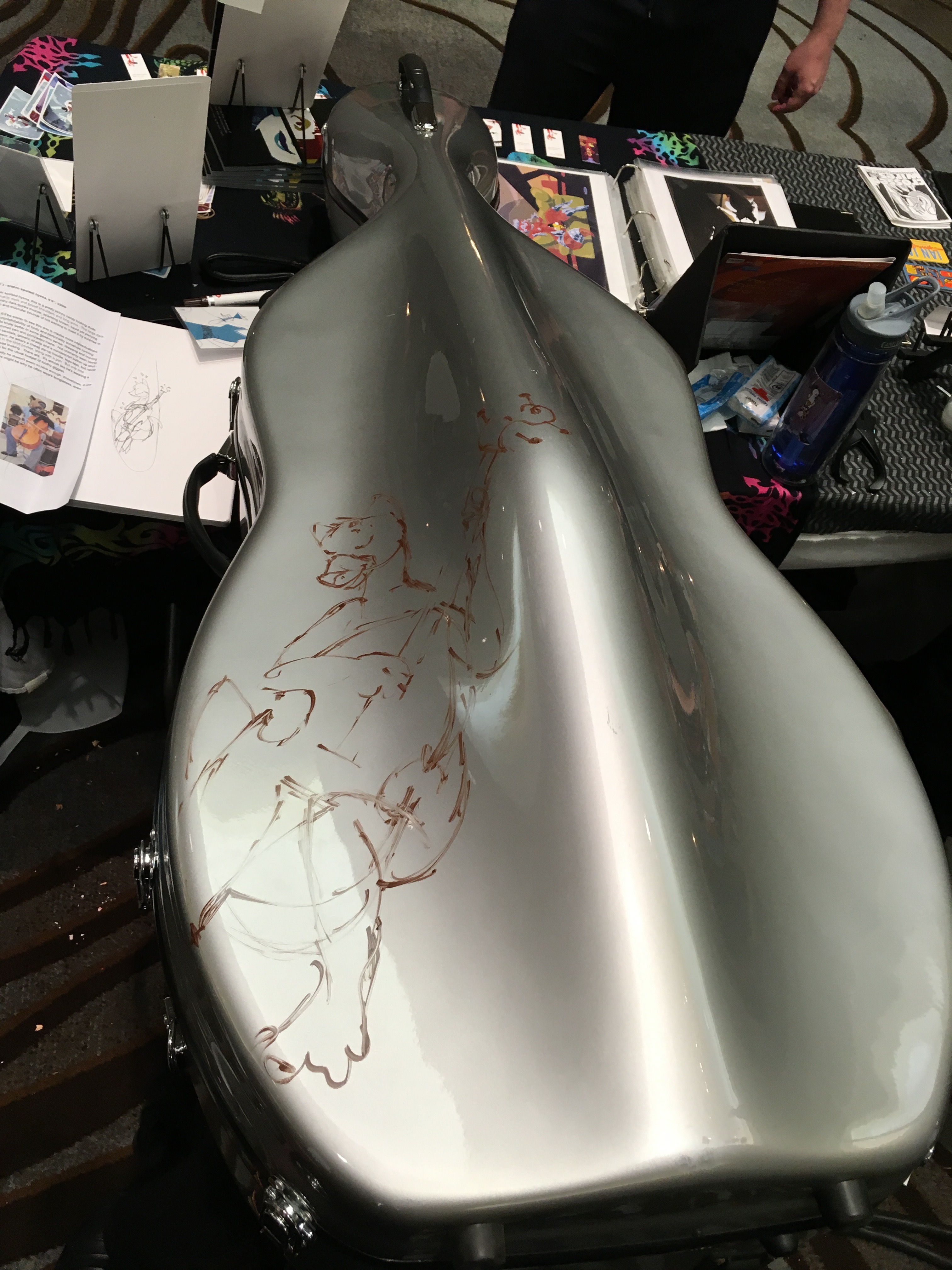 At the table, I was just starting to settle in to work on the sketchbook I’d taken Saturday when one of the people I’d done a badge for earlier came up with a cello case and some paint pens. I’d totally forgotten that he’d asked if I wanted to do that! But there was no way in hell I was going to turn something like that down; this sort of thing is part of why I come to cons in the first place.