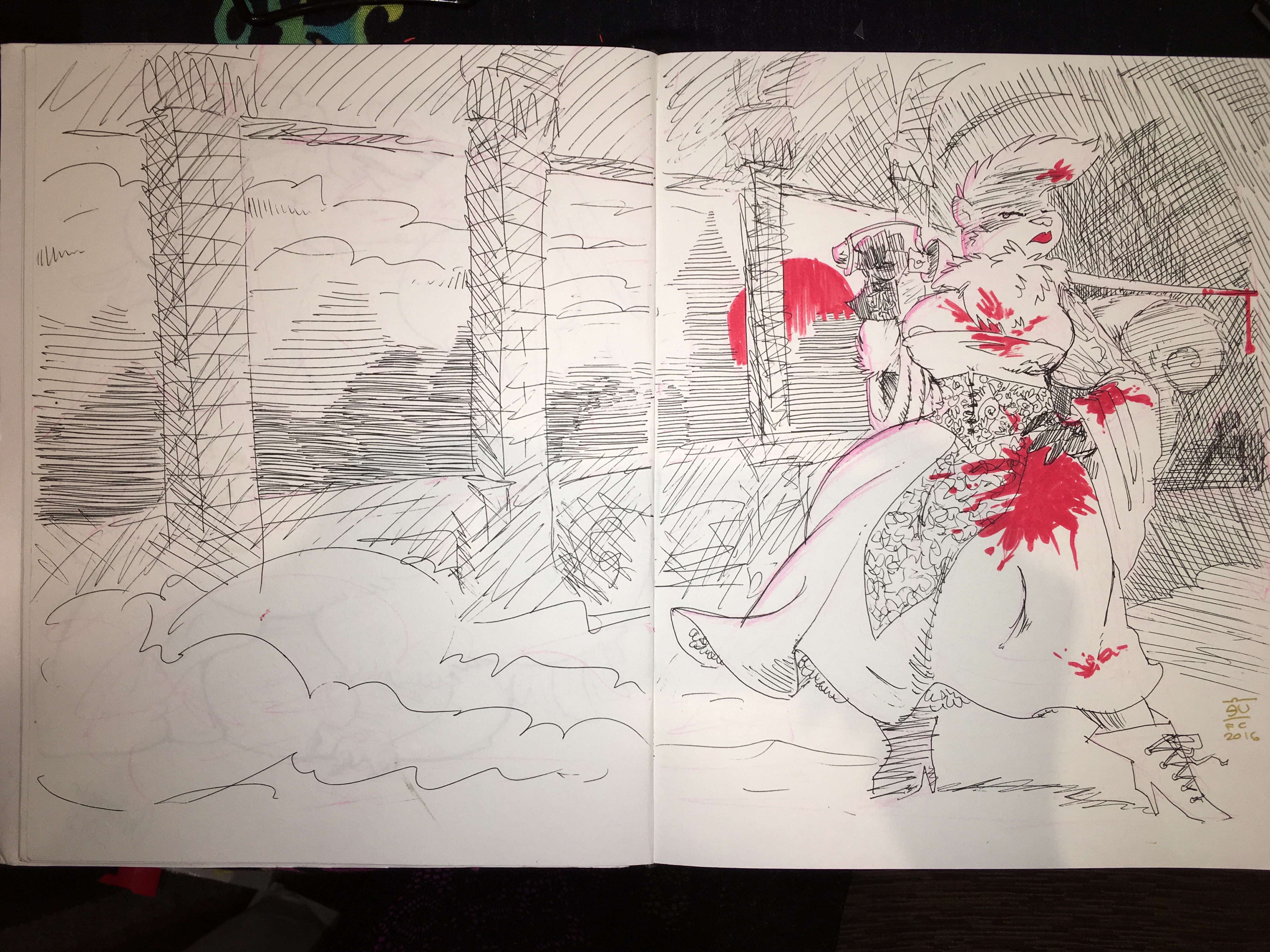 And then I just kinda settled down with that lingering sketchbook and chilled out doing a lot more noodly detail than that person was quite expecting. They’d asked for their character in Bloodborne, since we both play it, and I delivered a two-page spread of them standing in a particular hallway in Cainhurst with a lot of scribbly hatching and noodly clothing embroidery and red ink splattered on a lovely dress and a blood-red moon hanging ominously in the sky. They were pretty happy with the results.