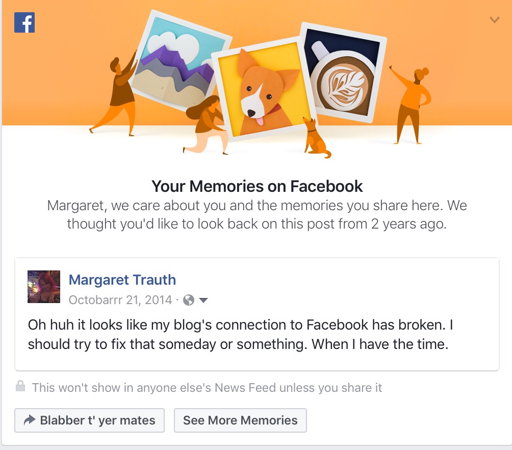 But it's sure gonna be a ton of fun when it starts being around the anniversary of my mom's death. Especially since I tend to look at Facebook on the tablet's browser and the “show less like this” button doesn't work there. (Yes I could install the app. No I'm not going to.)