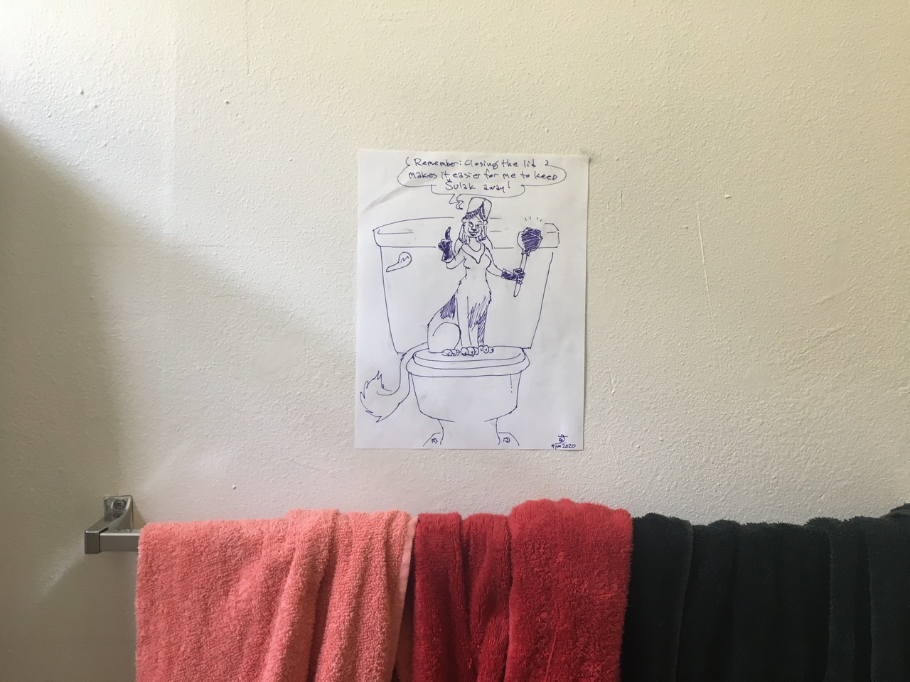So I drew one and put her in the bathroom, right above the toilet. Traditionally they wear a cap of divinity and hold a club; I took the slight liberty of modernizing this loadout with a pair of rubber gloves and a plunger. Which is surely a +6 Holy Avenger plunger given how it’s glowing.