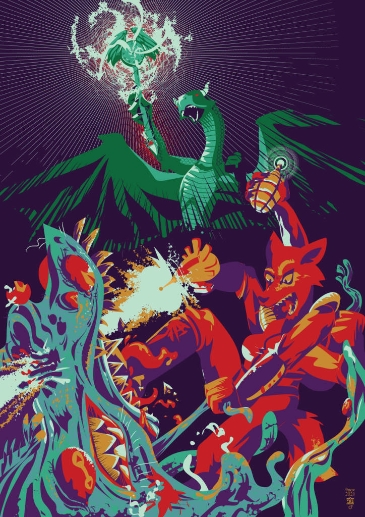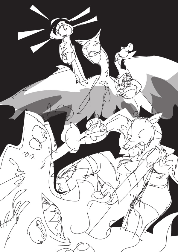 Really this one didn’t change much from the initial sketch, aside from some experimentation at the very end with the palette for Howell (the four-armed wolf lady in the front). Originally she was bright red, which popped a lot more, but made her look a bit too much like a fox rather than a wolf in the commissioner’s eyes.
