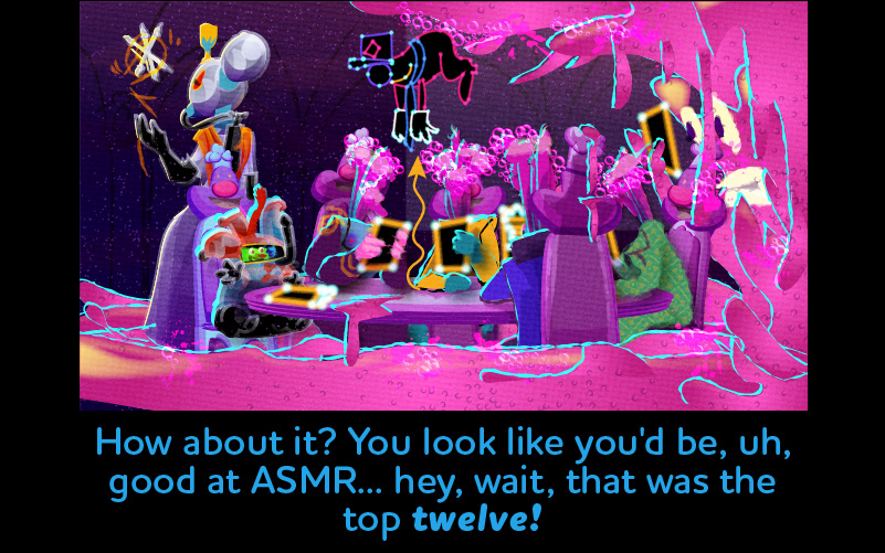 It is totally normal for holographic clowns to pop out of your cleavage and evaluate your friends’ performance. Zaffo is probably enjoying this more than she really should.
