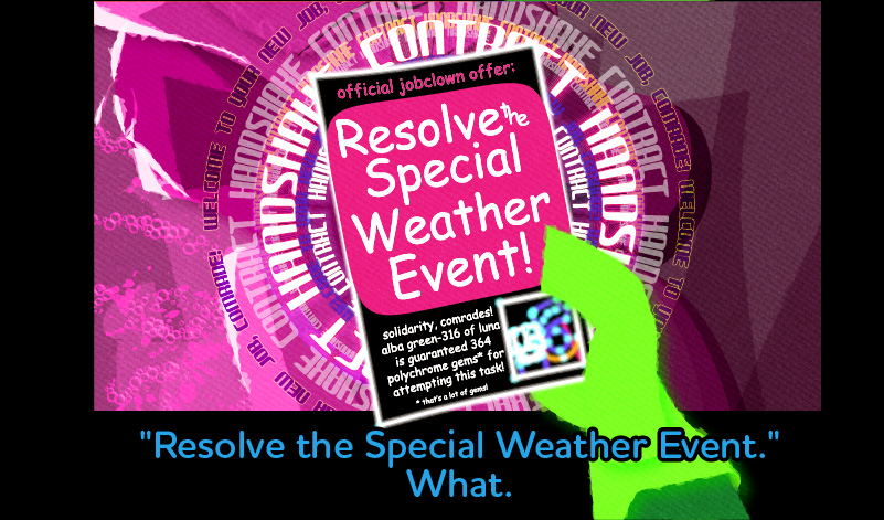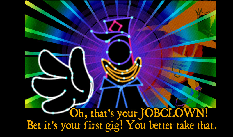 If this were an animated cartoon, there would be music suitable for the introduction of a boss enemy in a video game about tiny spaceships shooting other spaceships when Alba shakes Jobclown’s hand.